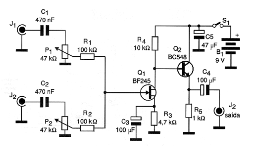 El mezclador de dos canales presentado en la figura consiste en la solución ideal para los casos en que necesitamos una configuración económica y eficiente. Aquí sólo hay dos canales de entrada, pero nada impide que la configuración se amplíe con la repetición de los pasos de entrada (C1, P1 y R1). El circuito tiene una alta impedancia de entrada y una buena ganancia gracias al uso de un transistor de efecto de campo de unión. La impedancia de salida es baja con una señal de buena amplitud capaz de excitar la mayoría de los amplificadores de audio común y otros equipos tales como transmisores, etc. Los jack de entrada pueden ser del tipo RCA, así como el de salida.