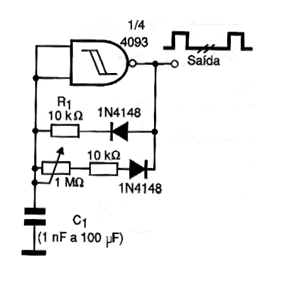 Con el circuito de la figura es posible generar pulsos cuya duración es dada por R1 y separación ajustada en el trimpot de 1 M ohms. El capacitor C puede tener valores entre 100 pF y 1000 ?F y la frecuencia máxima de operación para una alimentación de 12 V es del orden de 2 MHz. La alimentación se puede hacer con tensiones de 5 a 12 V, y la forma de onda del mismo, La señal de salida es rectangular.
