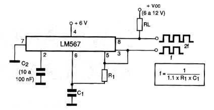 El LM567 es un decodificador de tono PLL que también se puede utilizar como oscilador doble según el ejemplo visto en el circuito de la figura. La tensión de alimentación debe estar entre 5 y 10 V, y la frecuencia máxima de operación de alrededor de 100 kHz. Los valores de los componentes en función de la frecuencia que se va a generar pueden calcularse mediante la fórmula dada junto al diagrama. Observe que la forma de onda de la señal es rectangular, y en una de las salidas tenemos el doble de la frecuencia de la otra.