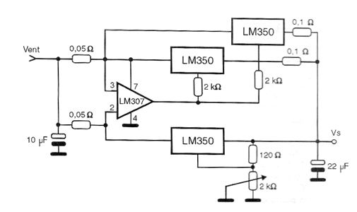 El circuito de la figura es sugerido por National Semiconductor y puede servir de base para una excelente fuente ajustable de 1,2 a 25 V con corriente de salida de hasta 10 ampères. Todos los circuitos integrados deben montarse en buenos radiadores de calor. Los resistores de 0,1 ohms en serie con los reguladores deben ser de alambre de al menos 2 W de disipación. La tensión de entrada debe ser por lo menos 2 V mayor que la tensión deseada en la salida en el punto máximo. Las pistas de circuito impreso para el montaje de este circuito regulador tienen que ser lo suficientemente amplias para que puedan trabajar con las altas intensidades de las corrientes de salida.
