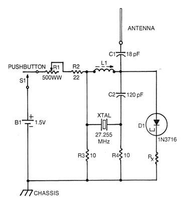 Este micro-transmisor para el rango de los 27 MHz fue encontrado en un documento técnico de 1976. El componente crítico es el diodo tunnel y la frecuencia es determinada por el cristal. La bobina debe tener alrededor de 0,3 uH de inductancia, preferiblemente con núcleo ajustable para obtener el punto de mejor rendimiento. El circuito es alimentado por una sola pila y el potenciómetro R1 de ajuste puede ser d 470 ohms de hilo. La antena es del tipo telescópico. Rx debe ser obtenido experimentalmente con valores entre 1 ohms y 4,7 ohms.