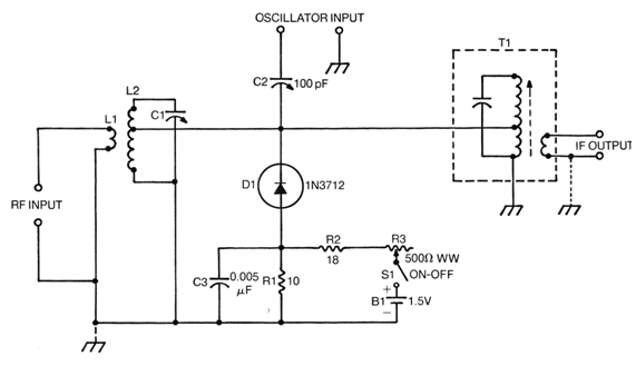 Hemos encontrado este circuito en una documentación de fábrica de los años 70. El circuito formado L1 / L2 y C1 debe ser sintonizado para la frecuencia de entrada y el circuito formado por T1 debe ser sintonizado para la frecuencia de salida, es decir, la frecuencia de diferencia entre la frecuencia de salida entrada y frecuencia del oscilador. El circuito trabaja con señales de poca intensidad y es ajustado por el potenciómetro R3. Este componente puede ser de 470 ohms de hilo. La alimentación es de 1,5 V hecha por una sola pila. El circuito alcanza frecuencias superiores a 1 GHz.