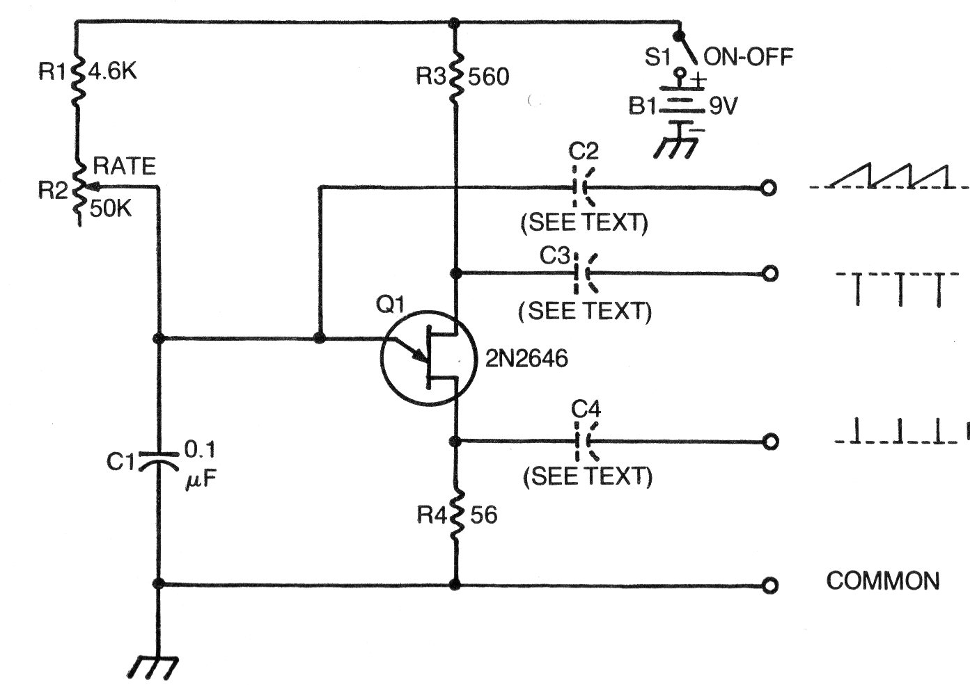 Encontramos este circuito básico de un oscilador de relajación con transistores unijuntura en una documentación de 1976. Los capacitores pueden tener valores entre 1 nF y 470 nF según la aplicación y la alimentación puede quedar entre 9 y 15 V típicamente. C1 y R2 / R1 determinan la frecuencia que puede cambiar en una amplia gama de valores.