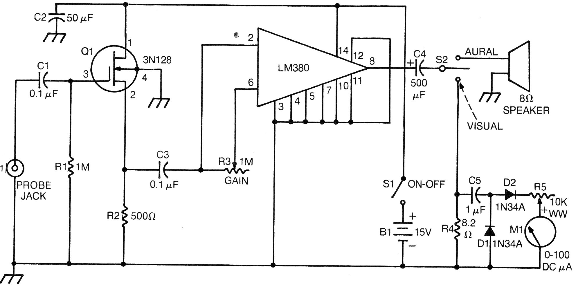 Tanto el transistor de efecto de campo como el circuito integrado de este circuito de los años 70 no son más comunes, pero se pueden utilizar equivalentes. El circuito es de un seguidor de señales muy sensible que debe ser alimentado por fuente de al menos 500 mA. El circuito tiene además un indicador de señal que puede ser sustituido por la escala más baja de las corrientes del multímetro. No utilice fuente sin transformador para alimentar este circuito. El cable de entrada de señal debe estar blindado.