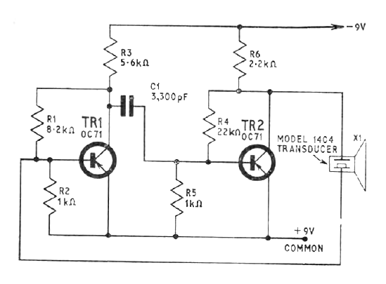 Encontramos este emisor ultrasónico en una publicación de 1964. El transductor es del tipo piezoeléctrico. Este circuito se puede utilizar junto con CIR7021S.