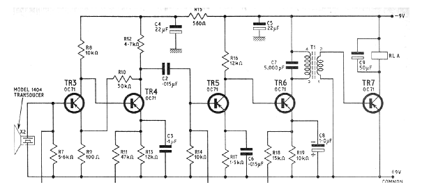 Este circuito, encontrado publicación de 1964, recibe señales ultrasónicas, accionando un relé. Se puede utilizar en control remoto, automatismos o alarmas. Transistores equivalentes modernos se pueden utilizar.