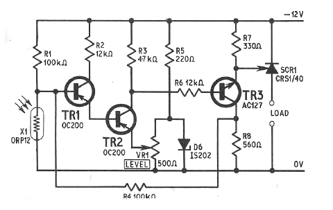 Encontramos este circuito en una publicación de 1970. Los transistores pueden ser sustituidos por equivalentes actuales y el LDR es del tipo común. Observe la polaridad de la alimentación. El SCR puede ser el TIC106.