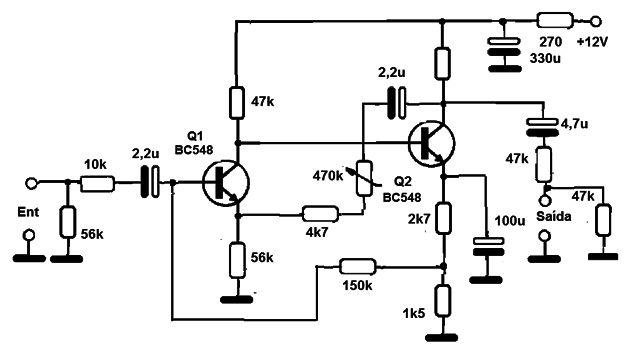Este circuito es de una publicación de 1980, pero también se puede montar con los transistores BC548 para Q1 y BC549 para Q2, además de los cambios que hemos hecho en la configuración original. El circuito tiene bajo consumo de energía y los cables de entrada y señales de salida deben estar blindados. La ganancia de bucle se establece en RV1. Si alimentado por la fuente, tiene que tener una excelente filtraje. La impedancia de entrada es alta y la salida tiene un nivel de señal de unos pocos cientos de milivolts, suficiente para excitar la entrada de la mayoría de los amplificadores.