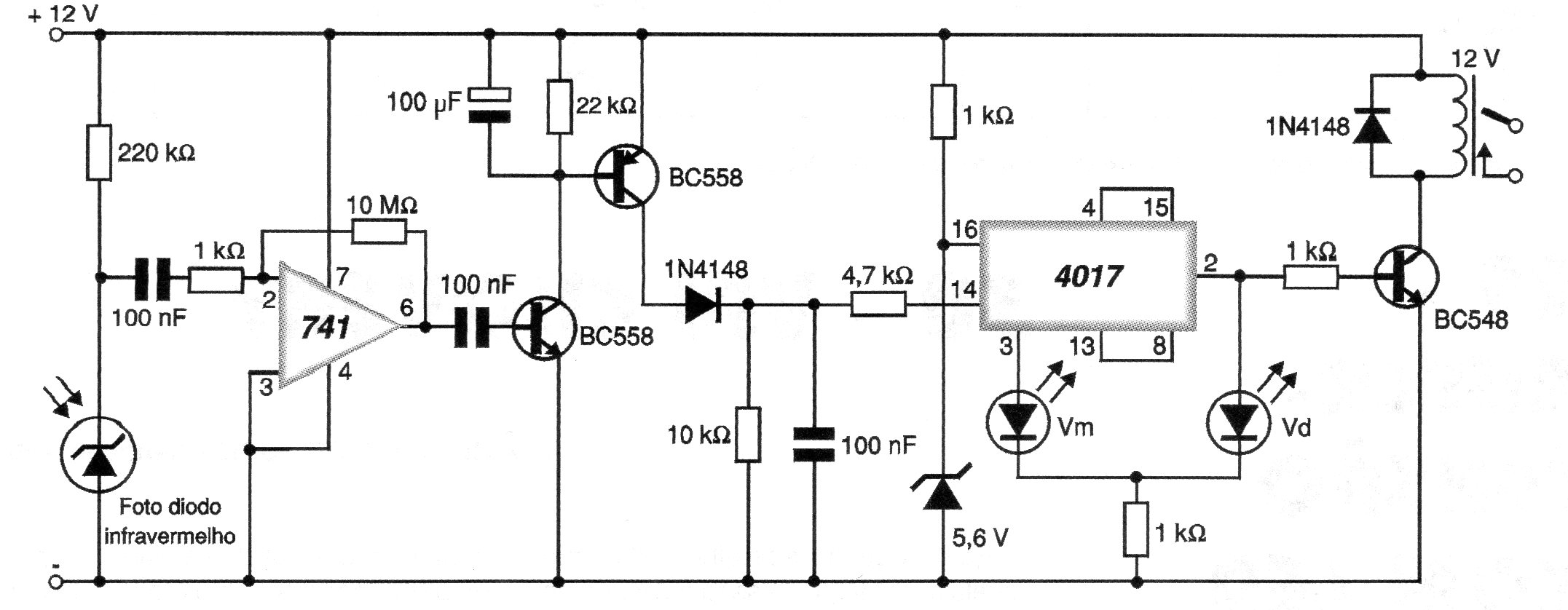 Este circuito de 2000 puede funcionar con uno de los muchos transmisores de control remoto por infrarrojos descritos en esta sección. El circuito acciona un relé de modo biestable, ya que tenemos un contador hasta 2 con el 4017. El circuito es alimentado por una tensión de 12 V y la carga controlada depende del relé usado.