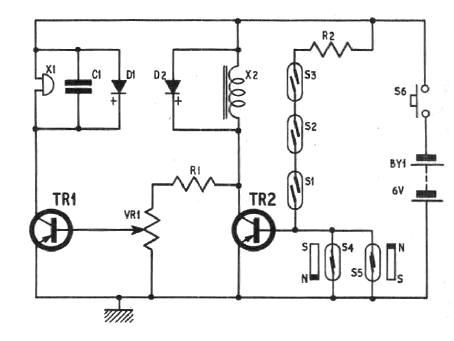 Este circuito es de una documentación de 1970. R1 puede tener 10k y P1 47k. Los transistores pueden ser BC558 o equivalente según el buzzer la alimentación puede ser hecha con tensiones de 6 a 12 V conforme el bocina. R2 es de 2k2.