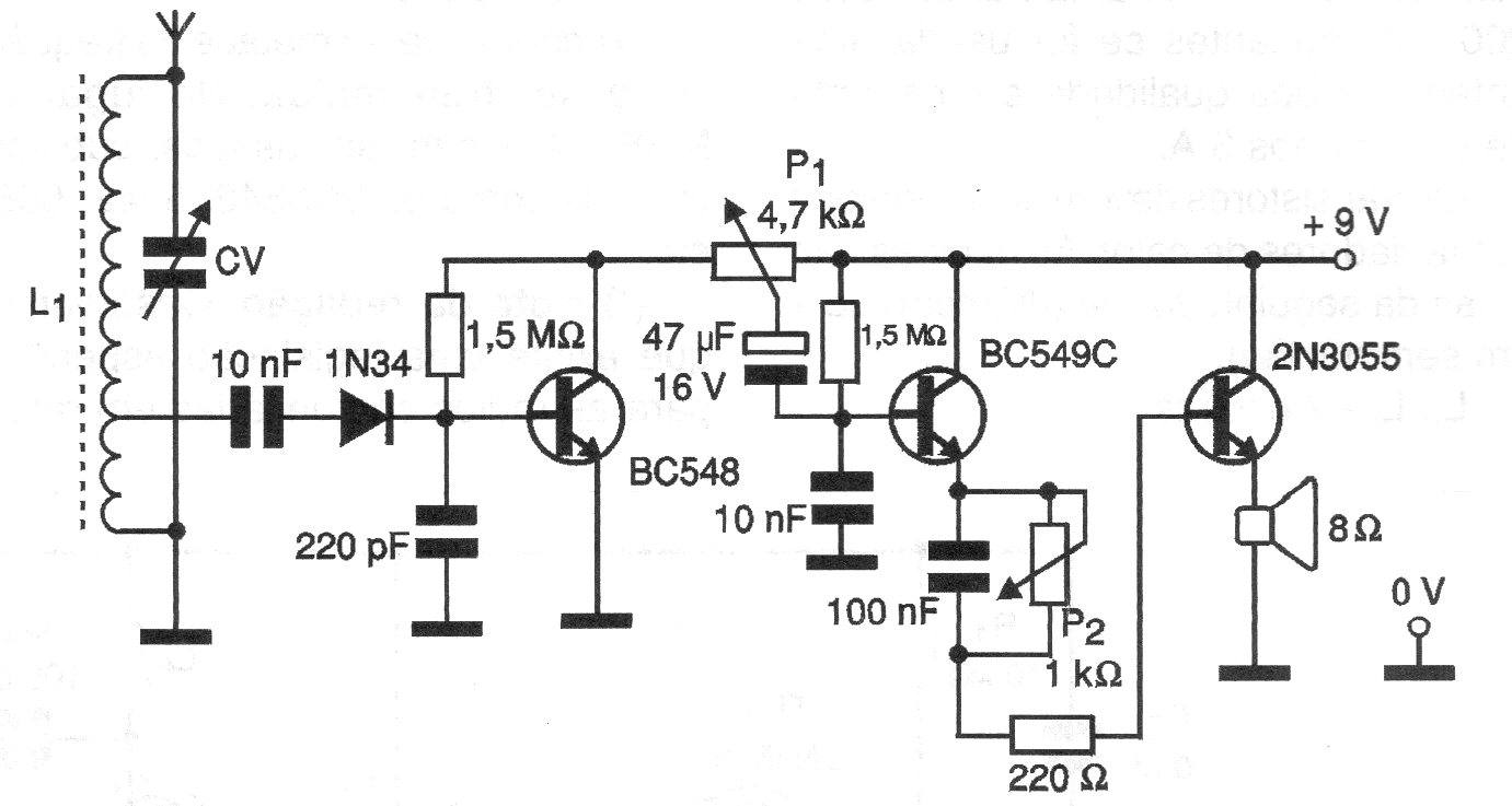 Este simple receptor experimental de AM fue encontrado en una documentación de 2000. La bobina consta de 30 + 70 espiras de hilo 28 o 30 en un bastón de ferrita y CV es una variable de receptor de AM fuera de uso. La antena puede tener de 2 a 10 metros de longitud. P2 es un control de tono.