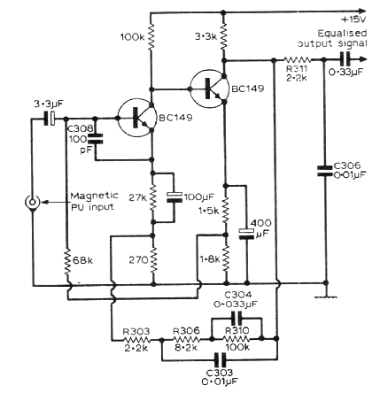 Este circuito es ideal para la recuperación de medios en vinilo, con la obtención de respuesta lineal a partir de la curva RIAA de las grabaciones. Los transistores pueden ser los BC548 y la fuente debe tener un excelente filtrado. El consumo es muy bajo.