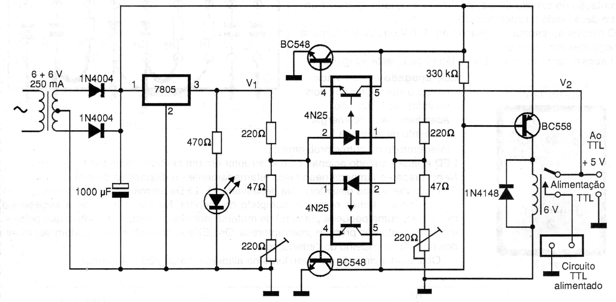 La finalidad de este circuito es impedir que los circuitos TTL reciban una tensión mayor que 5 V cuando estén en funcionamiento. El circuito utiliza un comparador que dispara el relé cuando la tensión supera los 5 V. El ajuste se realiza en dos trimpots.