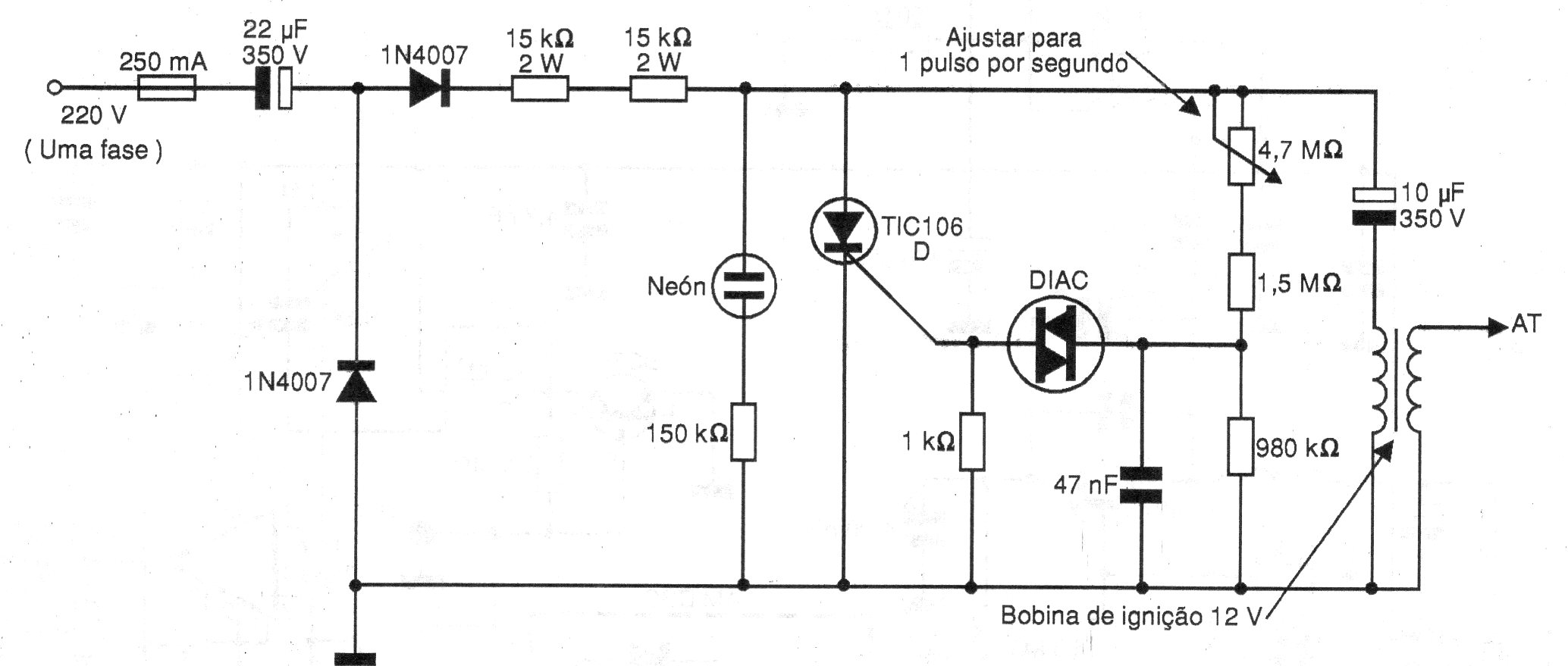 Este circuito utiliza una bobina de encendido para generar la alta tensión que electrifica una cerca. Sin embargo, en el original de 1999 no está previsto el aislamiento de la red de energía lo que es obligatorio. Esto se puede hacer a través de un transformador de aislamiento o bien utilizando un fly-back con tierra separada para generar la alta tensión.