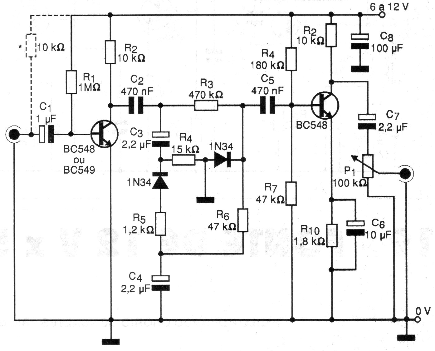 Este tipo de circuito se combina entre un micrófono y un transmisor para mejorar la modulación y así obtener mayor alcance. El circuito es de 1999, siendo utilizado por radioaficionados. La alimentación de 12 V puede ser aprovechada del transmisor y los cables de entrada y salida de señales deben ser blindados. El resistor punteado es para el caso de micrófonos de electreto.