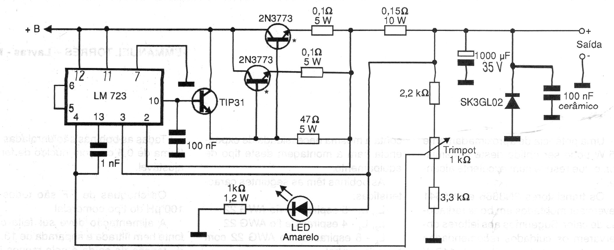 Esta fuente fue encontrada en una documentación antigua, basándose en un circuito integrado regulador popular en la época, el 723. Los transistores de potencia deben estar dotados de excelentes disipadores de calor y el ajuste de la tensión de salida se realiza en el trimpot. La entrada es de 15 V aproximadamente proveniente de transformador, rectificador y filtros comunes.