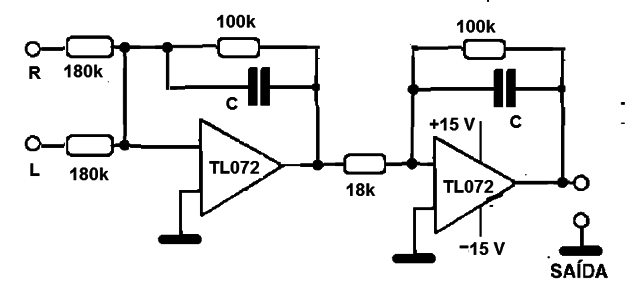 Este circuito originalmente se encontró en una publicación de 1997. Con los cambios, el circuito se puede montar fácilmente en la actualidad. El propósito del circuito es separar el grave para excitar un amplificador con un altavoz de subgraves en un sistema de cine en casa. El amplificador debe tener al menos 50 W de potencia para obtener buenos resultados. La fuente debe ser simétrica y cables de entrada y salida de señal deben estar blindados. El filtrado de la fuente debe ser excelente. Los capacitores C determinan la frecuencia de corte y pueden tener valores entre 47 nF a 220 nF normalmente. La impedancia de entrada es alta e baja la impedancia de salida con nivel de señal suficiente para excitar los amplificadores de audio más comunes.