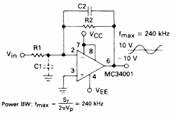 El circuito presentado es del Linear Databook de Motorola publicado en 1990. Como el CI es poco común actualmente, la configuración se puede aplicar a otros operacionales.