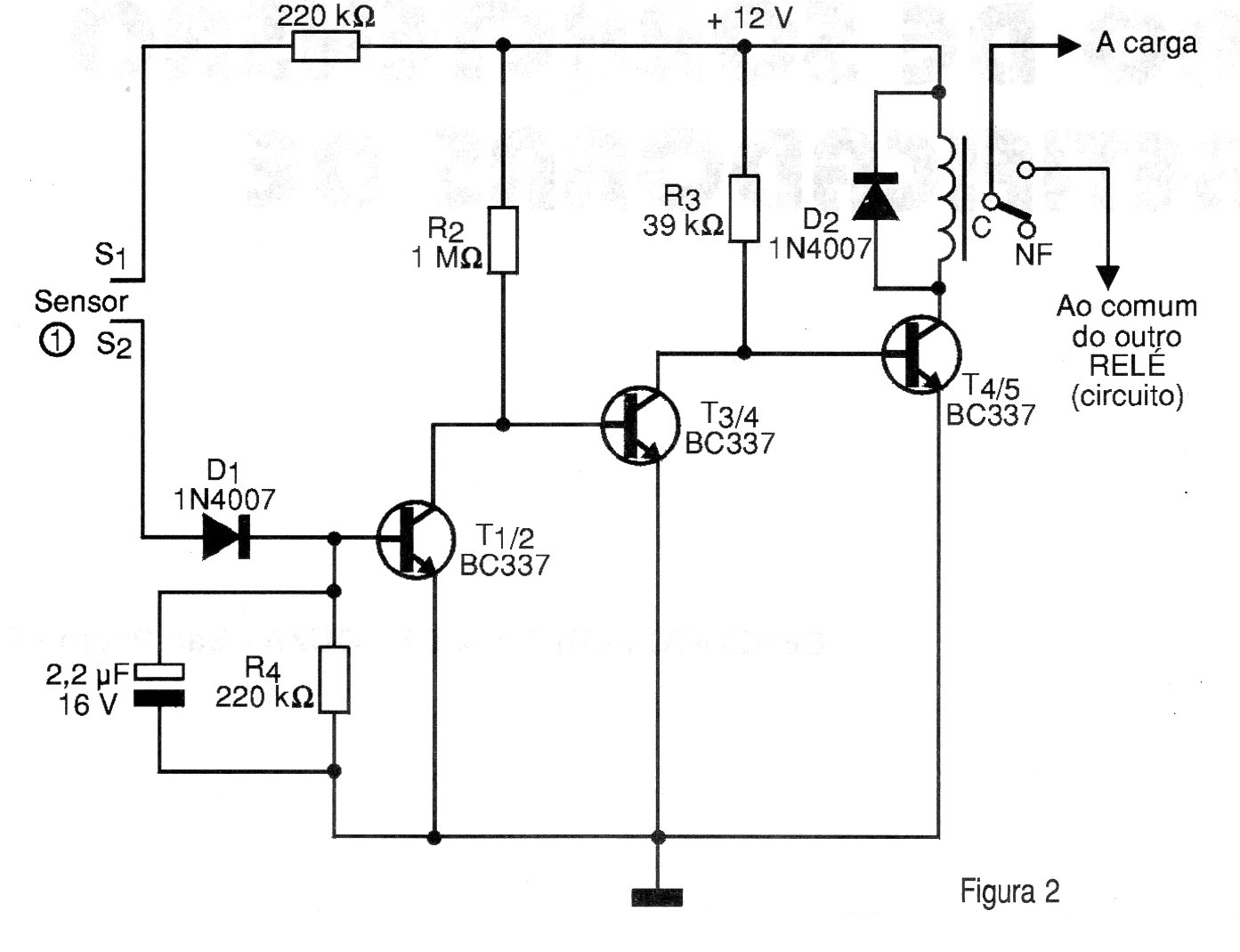 Este sensor funciona como una botonera electrónica, accionando un relé de potencia. El circuito debe ser alimentado por fuente con transformador y el sensor consiste en dos planchas de metal cercanas que deben ser tocadas simultáneamente.