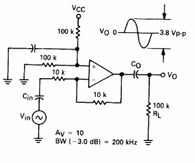 Este circuito con alimentación de 5 V fue sugerido por el Linear Databook de la Motorola de 1990. El circuito ha ganado 10 y una banda pasante de 100 kHz.