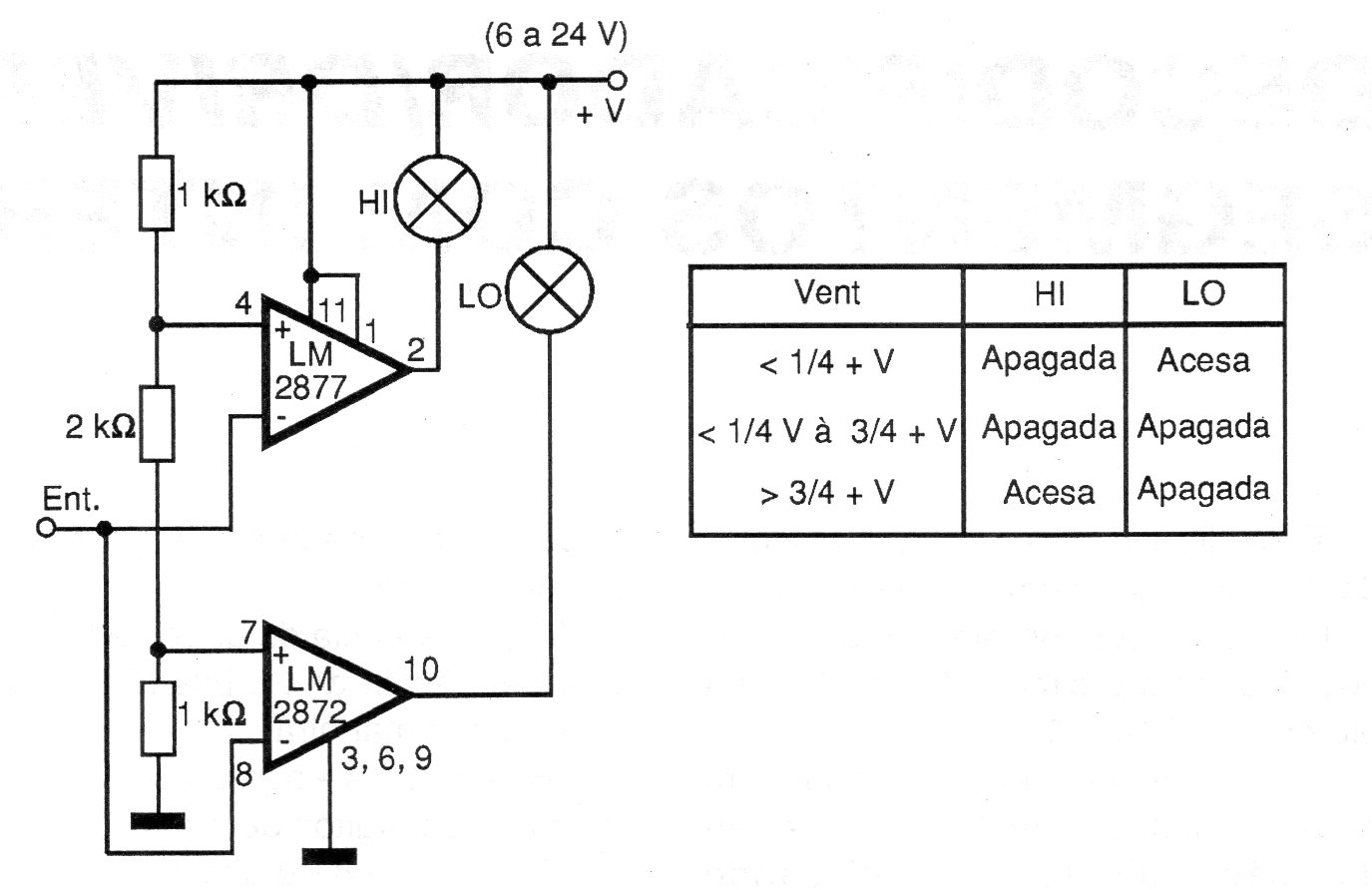 Este circuito es de un antiguo manual de National Semiconductor (ahora Texas), usando el LM2877 no muy común actualmente, pero que admite equivalente. El circuito opera con tensiones de 6 a 24 V y los valores de los disparos se dan en la tabla junto al diagrama. El circuito original acciona lámparas indicadoras, pero se pueden utilizar LED con resistencias en serie. La impedancia de entrada es de 4 M ohms.