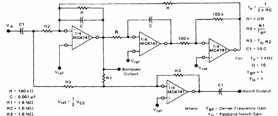 El circuito integrado MC4741 consiste en cuatro amplificadores operacionales similares al 741 en un envoltorio único. El circuito es del Linear Databook de Motorola de 1990 pudiendo ser implementado con operacionales 741 separados. Las fórmulas para calcular los componentes se adjuntan al diagrama.