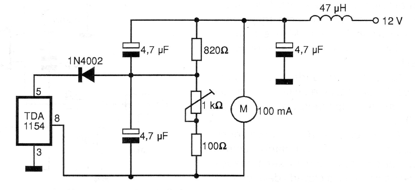 La finalidad de este circuito es mantener constante la velocidad de un pequeño motor de corriente continua de 100 mA. El circuito integrado utilizado no es muy común actualmente, pues el circuito es de 1999, y el ajuste de velocidad es hecho por un trimpot. La corriente máxima de salida del circuito integrado es de 1,2 A y la tensión máxima de 20 V.