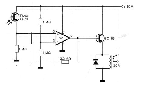 Este circuito de acción rápida utiliza como sensor cualquier foto-transistor. El circuito acciona un relé de 30 V, pero se pueden realizar cambios en el circuito operando con tensiones menores. Se pueden utilizar amplificadores operacionales equivalentes.
