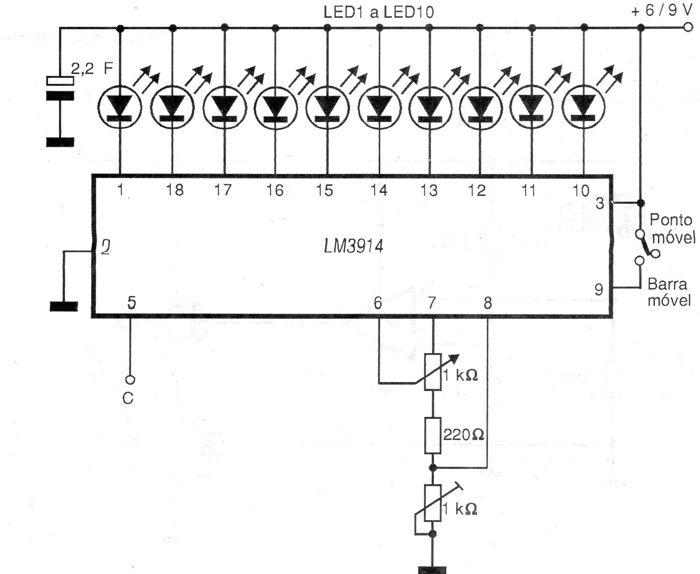 En este circuito mostramos cómo configurar el LM3914 como bargraph o punto móvil, alimentando 10 LED. El circuito tiene dos ajustes para las tensiones de entrada y puede ser alimentado por tensiones de 6 a 9 V. Varios artículos en este sitio se basan en esta aplicación.