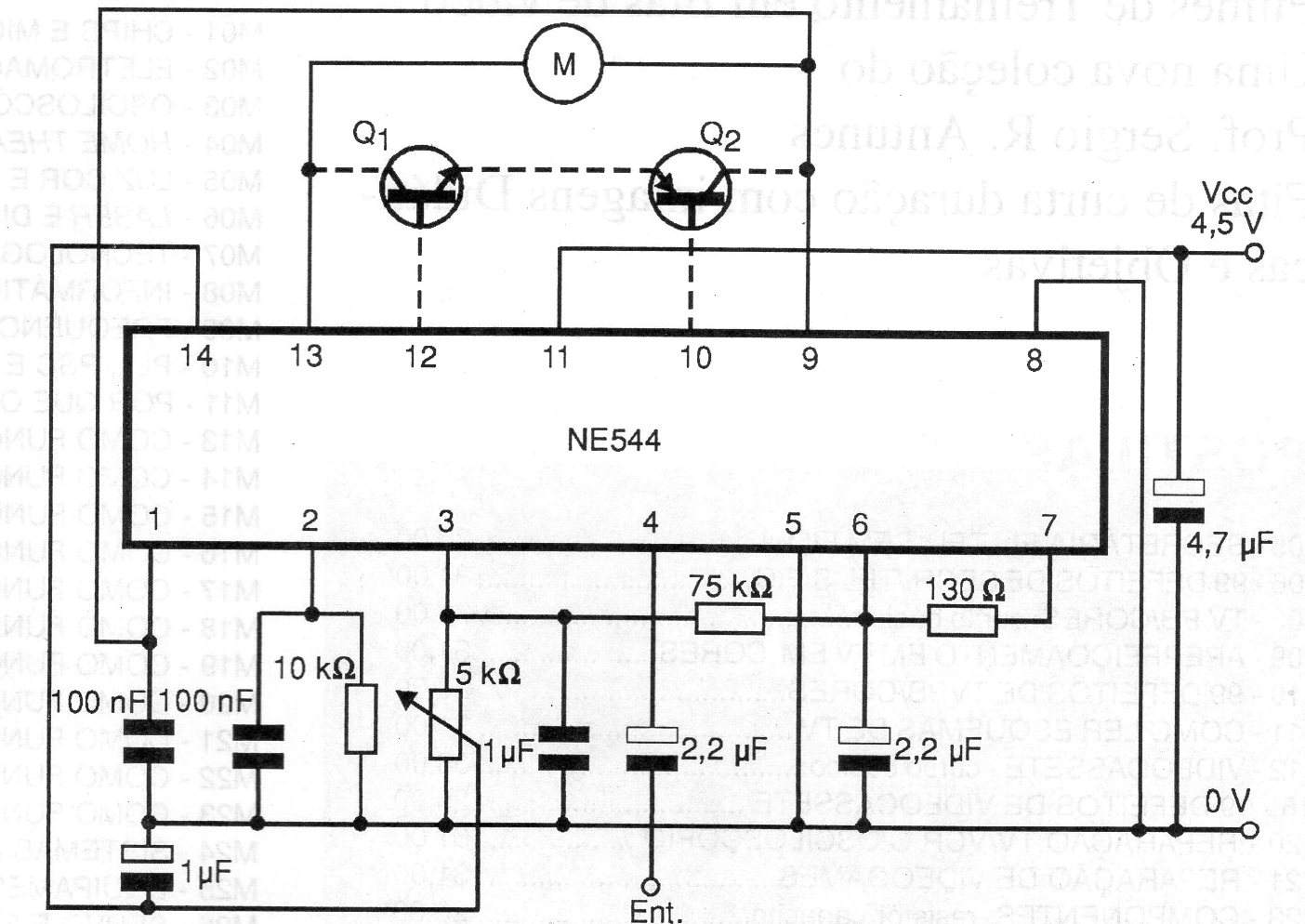 Este circuito es de una documentación de 1999. El circuito integrado utilizado no es muy común actualmente. Los dos transistores se utilizan si la corriente del motor es mayor que 500 mA. El circuito puede funcionar con tensiones de hasta 6 V.
