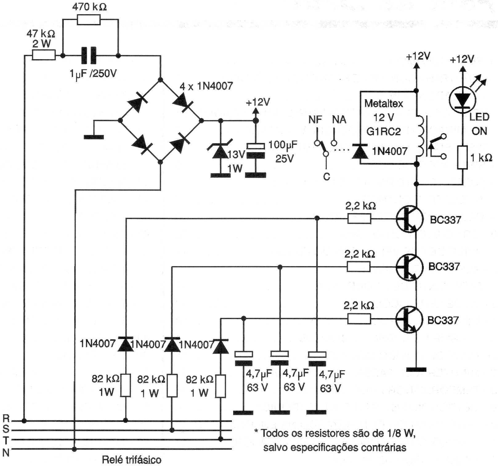 Este circuito es de una publicación de 2000 con el propósito de proteger un circuito trifásico disparando un relé cuando una de las fases falta. El relé se utiliza para apagar la carga de alimentación. El LED indica el disparo del relé.