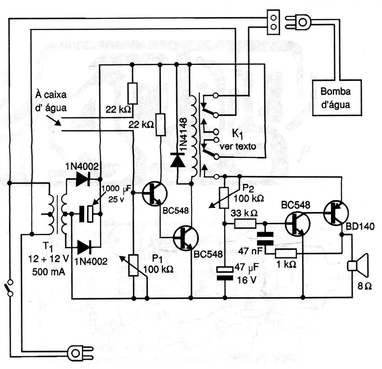 Este circuito desconecta automáticamente una bomba de agua cuando el nivel llega a un punto determinado por los sensores. El circuito es antiguo, pero los componentes usados todavía son actuales, lo que facilita bastante su montaje. Los sensores son hilos desencapados colocados en el nivel de accionamiento. K1 es de 12 V con contactos según la bomba.