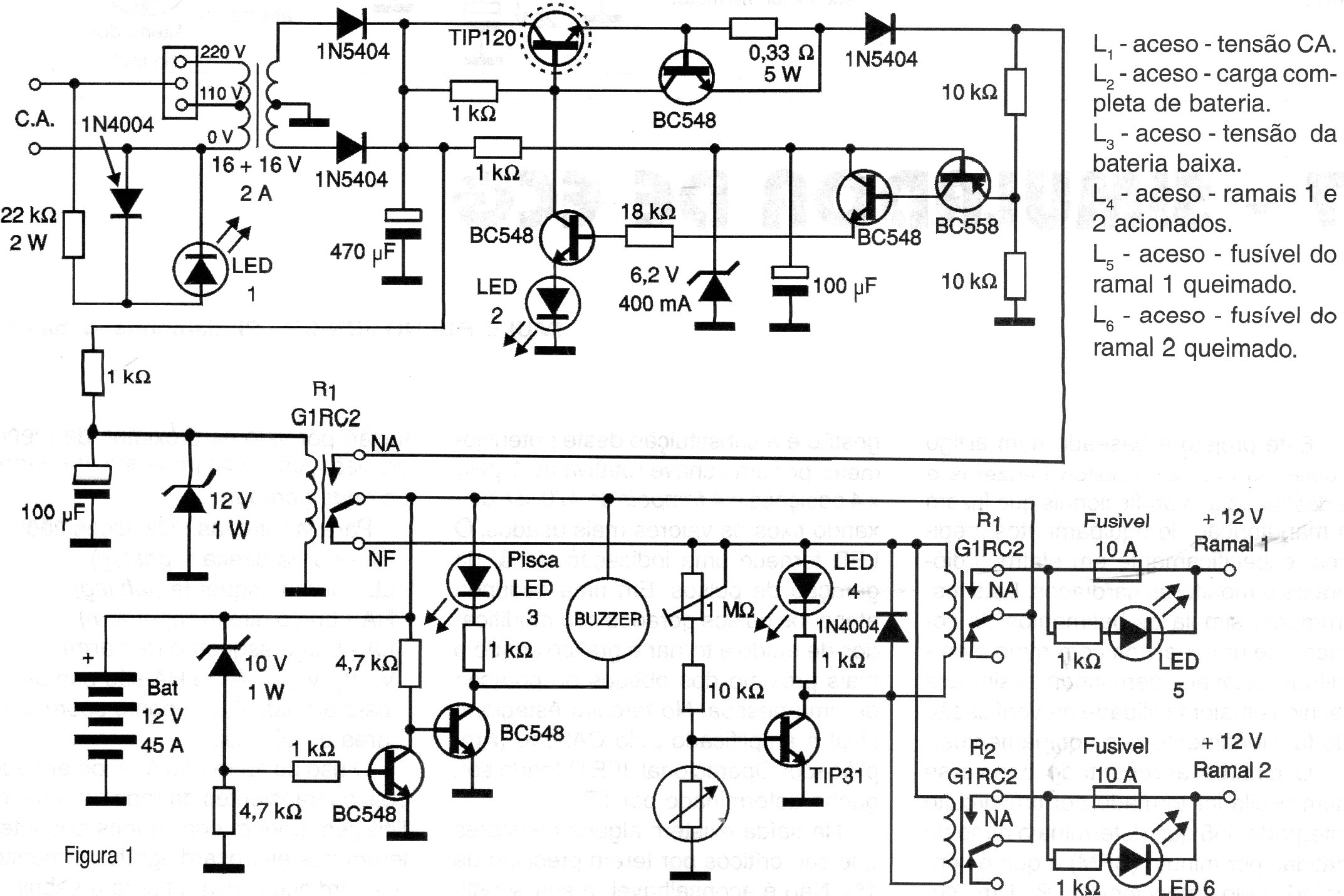 Este circuito es de una documentación del año 2000 y puede ser usado con inversor del CIR10285. El circuito contiene un cargador de batería automático y un sistema de alarma con un bocina. En caso de corte de energía y estando oscuro (ajuste en un trimpot de 1 M), el relé cierra sus contactos y el inversor se alimenta. El transistor de potencia de la fuente debe estar dotado de un disipador de calor. El circuito tiene varios indicadores.