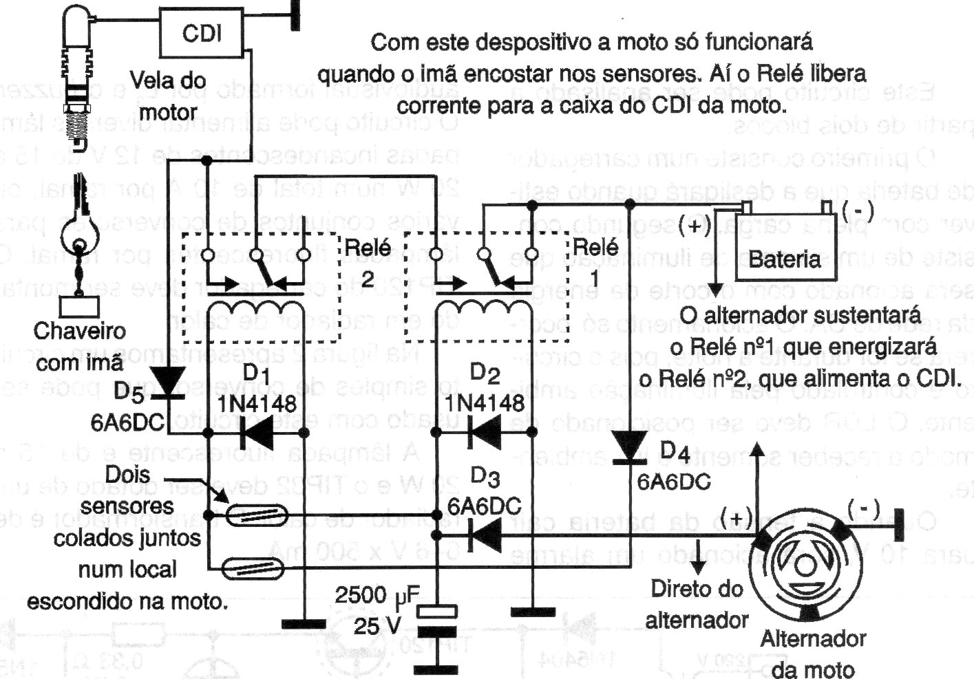 Encontramos este circuito en una documentación de 2000. El circuito hace que el arranque de la moto sólo pueda ser dado cuando un imán esté apoyado en los dos sensores. Con eso los relés liberan la corriente para moto y ella puede ser puesta en movimiento. Los relés son para corrientes de hasta 50 mA y contactos de al menos 5 A.