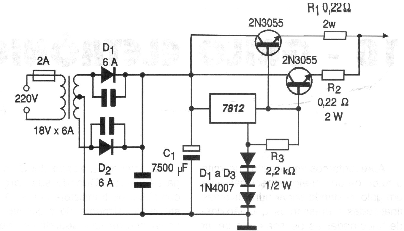 Este circuito, de una documentación de 2000, consiste en una fuente de 13,8 V con 5 A para la alimentación de equipos de uso automotriz. Los transistores de potencia deben estar dotados de excelentes disipadores de calor y los capacitores en paralelo con los diodos son cerámicos de 100 nF.