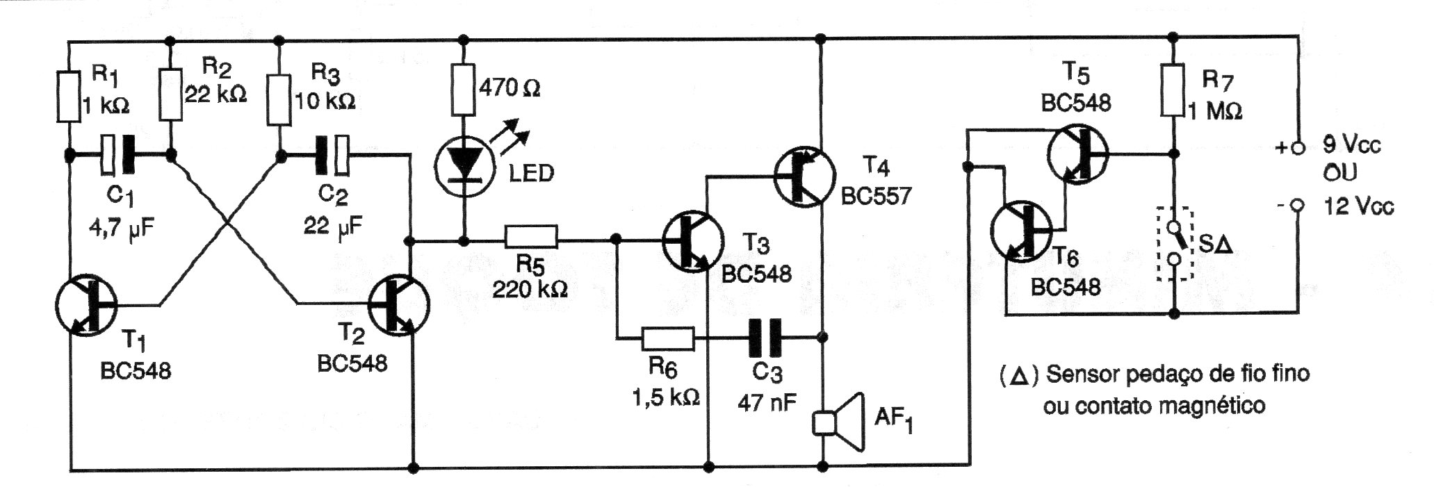 Este simple circuito de alarma se encontró en una documentación del año 2000. Por el uso como componentes básicos sólo los transistores que se pueden encontrar con facilidad su montaje es posible en nuestros días sin ningún problema. Los sensores pueden ser en mayor número, conectados en serie.