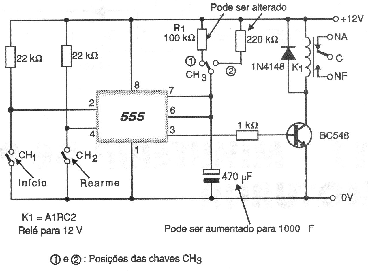 Este circuito tiene dos posiciones de programación que, con el capacitor usado permite obtener intervalos de 1 minuto y 15 segundos, e intervalos de 2 minutos y 45 segundos. Los intervalos dependen de la precisión de los componentes y sus valores se pueden cambiar. El relé es de 12 V, de acuerdo con la alimentación utilizada.