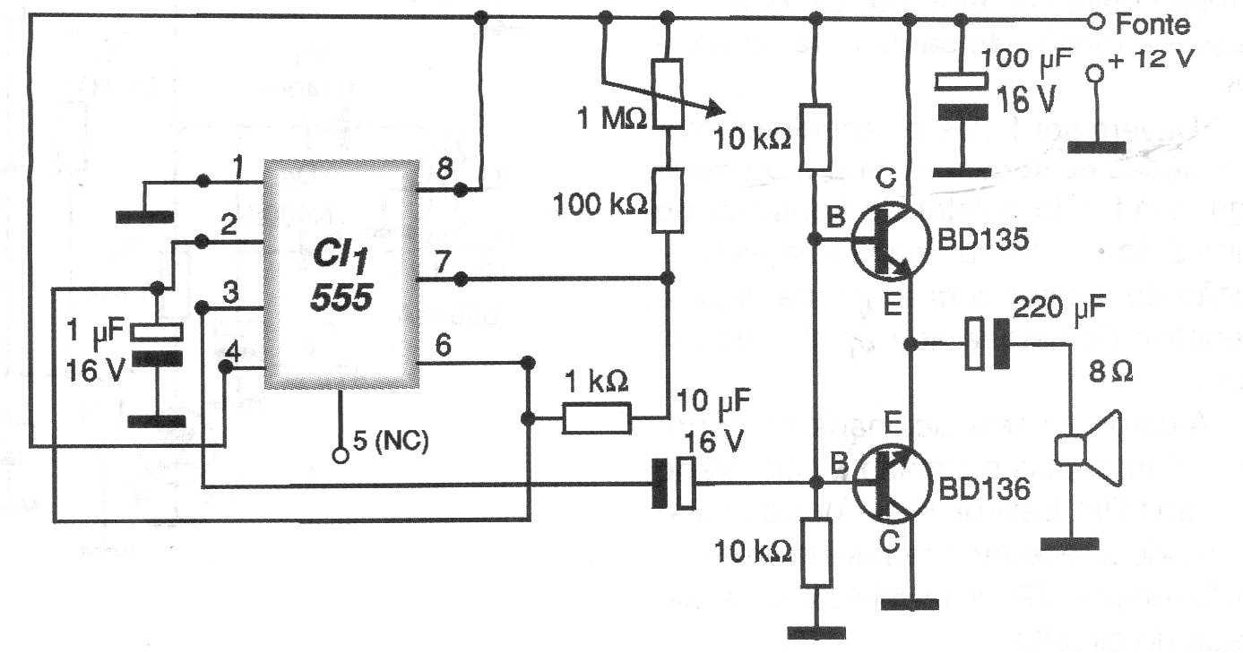 Este circuito es de una documentación del año 2000. Genera pulsos rápidos como una batería o lentos como un metrónomo, ajustados en el potenciómetro de 1 M. La alimentación, en realidad, puede ser hecha por tensiones de 6 a 12 V. Con 12 V es conveniente utilizar disipadores de calor para los transistores.