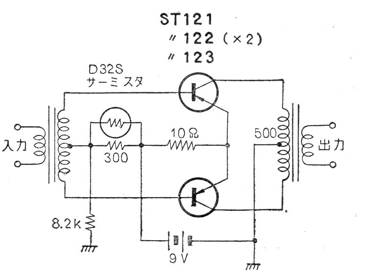 Este paso de salida de audio de 250 mW se obtuvo en una revista japonesa en 1967. El circuito usa un termistor para compensar la temperatura y los transistores son de germanio de esa época. Los transformadores son del tipo que se encuentra en los pasos similares de las antiguas radios de transistores.