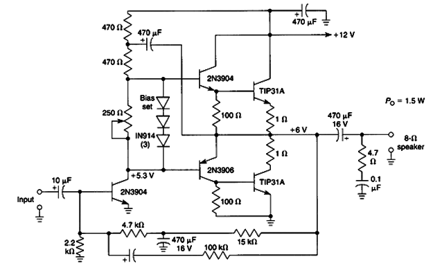 Este es un amplificador de audio muy tradicional con 12 V de alimentación, proporcionando a una carga de salida de 8 Ω 1.5W de potencia. Los transistores de uso general NPN y PNP pueden ser el BC548 y BC558. Los diodos pueden ser el 1N4148 y el ajuste de la corriente de reposo deben ser tales para medir -5,3 V en el colector del transistor de entrada. El potenciómetro puede ser de 220 ohmios que es el valor comercial más común. Los transistores de salida deben estar provistos de radiadores de calor. La fuente de alimentación debe tener una corriente de 500 mA y una versión estéreo, se debe utilizar una fuente común para los dos canales. La impedancia de entrada es alta y el cable de señal de entrada debe ser blindado.