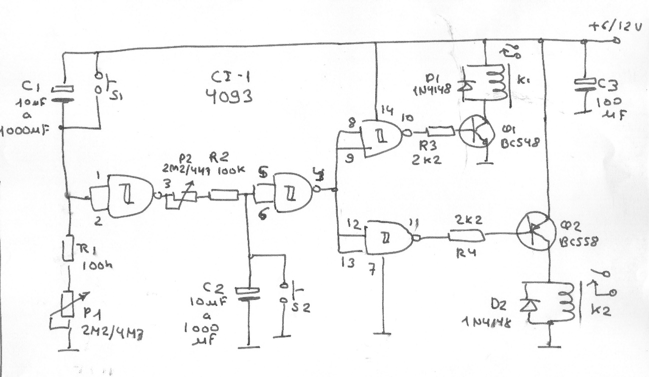 En la figura tenemos una aplicación más elaborada de un temporizador que activa dos relés de forma complementaria (cuando uno apaga el otro), con los tiempos de activación y cuando finaliza la activación ajustados por dos potenciómetros (P1 y P2).