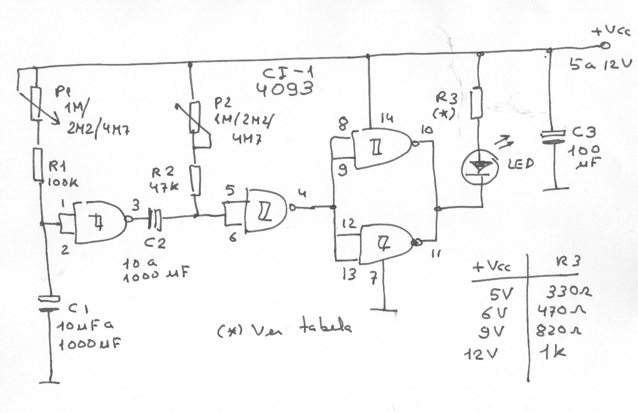 En la figura 1 tenemos un circuito que se enciende después de cierto tiempo y luego se apaga, también después de un segundo intervalo. Los dos intervalos se establecen en P1 y P2.