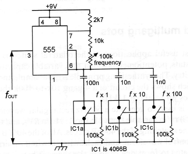 Podemos controlar la frecuencia de un oscilador desde circuitos digitales o desde la salida de un microcontrolador con el circuito que se muestra en la figura. Dependiendo de la salida de control activada o su combinación, colocamos capacitores de diferentes valores en el circuito y así tenemos diferentes frecuencias para el 555. El control se realiza por la tensión del microcontrolador que debe alimentar el interruptor CMOS, aunque el 555 Puede ser alimentado con tensión diferente.
