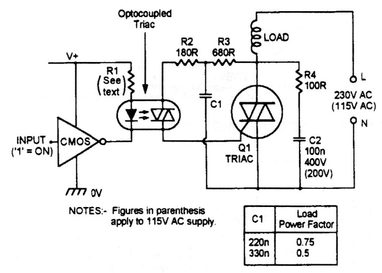Este escudo, que se encuentra en la documentación en inglés antiguo, aparece con variaciones en otras partes de esta sección y en el sitio web. El circuito está diseñado para impulsar cargas de CA inductivas como motores y solenoides. Puede impulsar un triac alimentado por CA de alta potencia desde una salida CMOS o directamente desde un microcontrolador. La activación se realiza con la salida a bajo nivel. R1 tendrá 220 ohms para salidas de 3,3 V y 330 ohms para salidas de 5 V. Se puede utilizar cualquier optodiac, dependiendo de la tensión de red.