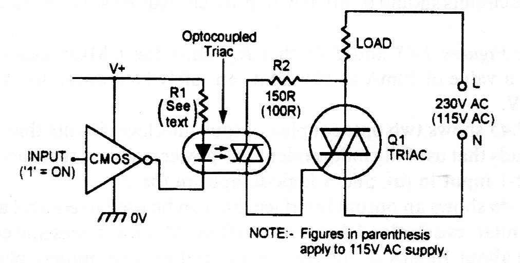 Este circuito permite conducir un triac con carga de CA de alta potencia desde una salida CMOS o directamente desde un microcontrolador. La activación se realiza con la salida a bajo nivel. R1 tendrá 220 ohms para salidas de 3,3 V y 330 ohms para salidas de 5 V. Se puede utilizar cualquier optodiac, dependiendo de la tensión de red.