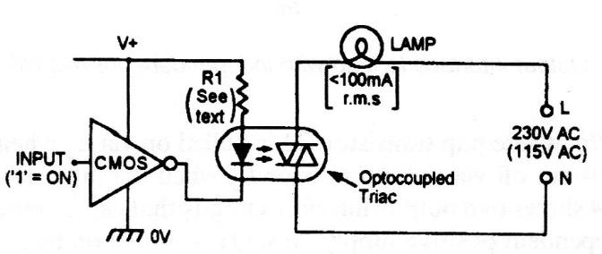 En esta aplicación, a partir de documentación en inglés, tenemos la forma de activar una carga AC de hasta 10 W (100 mA) utilizando un opto diac sin necesidad de componentes adicionales. La excitación se puede realizar a través de un puerto CMOS como se indica o directamente a través de la salida de un microcontrolador.