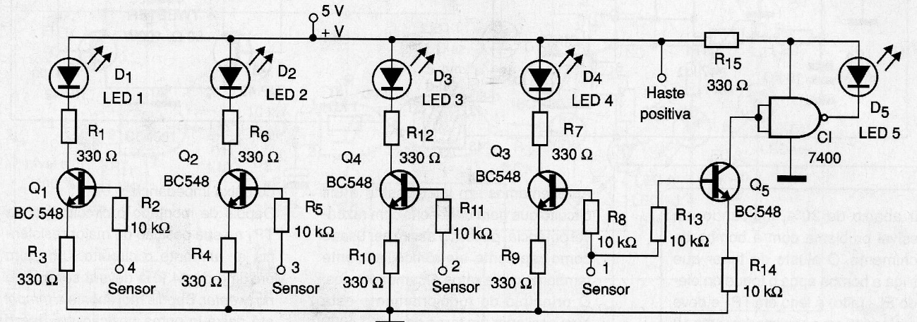 El circuito muestra el nivel del agua en un depósito, mostrándolos encendiendo los LED. Con LED4 encendido, la caja está completamente llena y con LED1 encendido solo la caja está en su nivel mínimo. Los sensores son varillas de cobre instaladas en el interior de la caja de su lado, con distancias definidas que determinarán los puntos gatillo. La varilla positiva debe colocarse en la parte inferior de la caja. Cada sensor de nivel está conectado a la base de un transistor que sirve como disparador del LED correspondiente al nivel. El circuito debe alimentarse con una tensión de 5 V y la fuente debe estar aislada de la fuente de alimentación. El circuito se puede ampliar a un mayor número de sensores. Estos sensores deben tener al menos 10 cm de parte desnuda para el contacto con el agua. (2006)