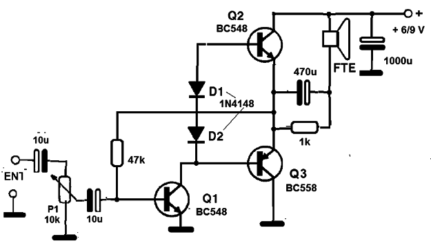 Usando el par complementar BC548 y BC558, este amplificador de baja potencia proporciona una salida de unos pocos cientos de miliwatts de buena calidad de sonido. Podemos utilizar este circuito como etapa de salida para intercomunicadores, radio y multimedia o reforzador para pequeña cajas adicionales MP3. El circuito puede ser alimentado con tensiones de 3-6 V y la ganancia viene dada por R2. Si se utiliza la fuente de alimentación debe tener 200-500 mA, con una excelente filtraje, para evitar los ronquidos. La entrada es de alta impedancia y para una mejor calidad de sonido, el altavoz debe ser de al menos 10 cm. El circuito es de un libro de Newton C. Braga.