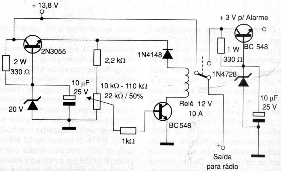 Este circuito se dispara cuando la tensión de entrada supera los 13,8 V, que es un valor importante en el caso de las fuentes de automoción. El relé es de 12 V y el punto de activación se establece en la olla. El transistor 2N3055 debe tener un pequeño radiador de calor.