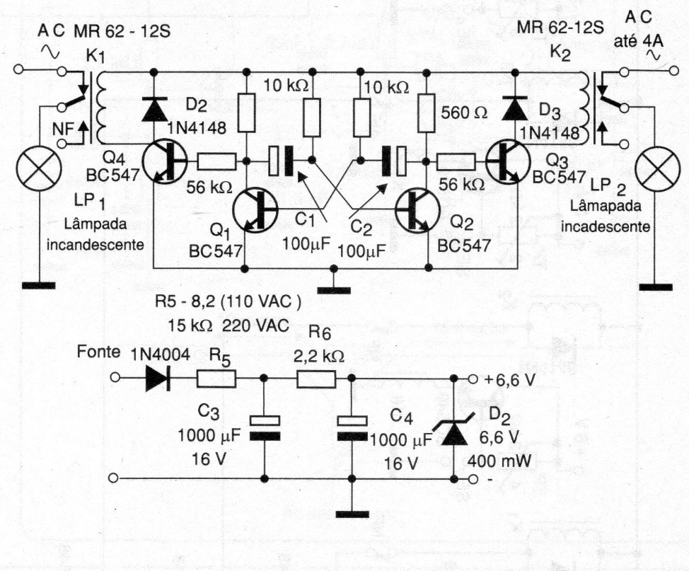 Este circuito común que utiliza un multivibrador hace que dos lámparas parpadeen alternativamente a una frecuencia y ciclo activo determinados por los condensadores. El circuito está alimentado por 6 V que es la tensión de los relés utilizados. Los transistores también pueden ser el BC548.